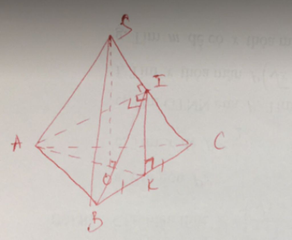 $ \Rightarrow IA = IB = \dfrac{{a\sqrt 2 }}{2} \\ \left\{ {\begin{array}{*{20}{c}} {AI \bot BC} \\ {AK \bot BC} \end{array}} \right. \\ \Rightarrow IK \bot BC \\ \Delta IKB \bot K \\ I{B^2} = I{K^2} + B{K^2} \\ \Rightarrow I{K^2} = I{B^2} - B{K^2} \\ = {\left( {\dfrac{{a\sqrt 2 }}{2}} \right)^2} - {\left( {\dfrac{a}{2}} \right)^2} \\ = \dfrac{{{a^2}}}{4} \\ \Rightarrow IK = \sqrt {\dfrac{{{a^2}}}{4}} = \dfrac{a}{2} \\ \Delta IKC \bot K \\ \Rightarrow I{C^2} = I{K^2} + K{C^2} \\ = {\left( {\dfrac{a}{2}} \right)^2} + {\left( {\dfrac{a}{2}} \right)^2} \\ = \dfrac{{{a^2}}}{2} \\ \Rightarrow IC = \dfrac{{a\sqrt 2 }}{2} \\ \Delta SAI \bot I \\ \Rightarrow S{A^2} = S{I^2} + A{I^2} \\ \Rightarrow S{I^2} = S{A^2} - A{I^2} \\ = S{A^2} - {\left( {\dfrac{{a\sqrt 2 }}{2}} \right)^2} \\ \Rightarrow SI = \sqrt {S{A^2} - {{\left( {\dfrac{{a\sqrt 2 }}{2}} \right)}^2}} \\ \Rightarrow SC = SI + IC \\ = \sqrt {S{A^2} - {{\left( {\dfrac{{a\sqrt 2 }}{2}} \right)}^2}} + \dfrac{{a\sqrt 2 }}{2} \\ SC = SA \\ \Rightarrow \sqrt {S{A^2} - {{\left( {\dfrac{{a\sqrt 2 }}{2}} \right)}^2}} + \dfrac{{a\sqrt 2 }}{2} = SA \\ \Leftrightarrow \sqrt {S{A^2} - {{\left( {\dfrac{{a\sqrt 2 }}{2}} \right)}^2}} = SA - \dfrac{{a\sqrt 2 }}{2} \\ \Rightarrow S{A^2} - {\left( {\dfrac{{a\sqrt 2 }}{2}} \right)^2} = {\left( {SA - \dfrac{{a\sqrt 2 }}{2}} \right)^2} \\ \Leftrightarrow S{A^2} - \dfrac{{{a^2}}}{2} = S{A^2} - a\sqrt 2 SA + \dfrac{{{a^2}}}{2} \\ \Rightarrow a\sqrt 2 SA = {a^2} \\ \Rightarrow SA = \dfrac{{{a^2}}}{{a\sqrt 2 }} = \dfrac{a}{{\sqrt 2 }} \\ AO = \dfrac{2}{3}AK = \dfrac{2}{3}.\dfrac{{a\sqrt 3 }}{2} = \dfrac{{a\sqrt 3 }}{3} \\ \Delta SAO \bot O \\ \Rightarrow S{A^2} = S{O^2} + O{A^2} \\ \Rightarrow S{O^2} = S{A^2} - O{A^2} \\ = {\left( {\dfrac{a}{{\sqrt 2 }}} \right)^2} - {\left( {\dfrac{{a\sqrt 3 }}{3}} \right)^2} \\ = \dfrac{{{a^2}}}{6} \\ \Rightarrow SO = \sqrt {\dfrac{{{a^2}}}{6}} = \dfrac{{a\sqrt 6 }}{6} \\ {S_{ABC}} = \dfrac{{{a^2}\sqrt 3 }}{4} \\ \Rightarrow {V_{SABC}} = \dfrac{1}{3}.SO.{S_{ABC}} \\ = \dfrac{1}{3}.\dfrac{{a\sqrt 6 }}{6}.\dfrac{{{a^2}\sqrt 3 }}{4} \\ = \dfrac{{{a^3}\sqrt 2 }}{{24}} \\ $