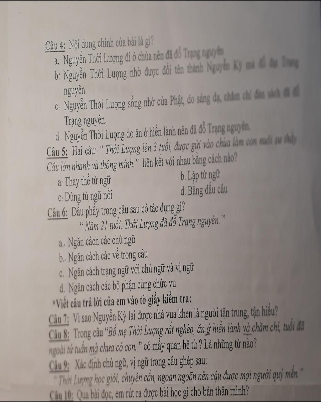 Câu 4: Nội dung chính của bải là gi? a. Nguyễn Thời Lượng đi ở chùa nên đã đỗ Trạng nguyên b: Nguyễn Thời Lượng nhờ đuợc đổi tên thành Nguyễn Kỳ mà để đự Tong nguyên. C: Nguyễn Thời Lượng sống nhờ của Phật, do sáng dạ, châm chỉ đèn sich đi Trạng nguyên. d. Nguyễn Thời Luợng do ăn ở hiển lành nên đã đổ Trạng nguyên. Câu 5: Hai câu: “ Thời Lượng lên 3 tuổi, được giải vào chùa làm cọn nuôi su thấy Cậu lớn nhanh và thông minh." liên kết với nhau băng cách nào? a: Thay thể từ ngữ C: Dùng từ ngũ nối Câu 6: Dâu phây trong câu sau có tác dụng gì? “ Năm 21 tuổi, Thời Luợng đã đô Trạng nguyên. " a. Ngăn cách các chủ ngữ b. Ngăn cách các về trong câu c. Ngăn cách trạng ngữ với chủ ngữ và vị ngữ d. Ngăn cách các bộ phận cùng chức vụ *Viết câu trả lời của em vào tờ giấy kiêm tra: Câu 7; Vì sao Nguyễn Kỳ lại được nhà vua khen là người tận trung, tận hiểu? Câu 8: Trong câu “Bổ mẹ Thời Luợng rất nghèo, ăn ở hiển lành và chăm chị, tuổi đã ngoài tứ tuần mà chưa có con. " có mây quan hệ từ ? Là những từ nào? Cầu 9: Xác định chủ ngữ, vị ngữ trong câu ghép sau: Thời Luợng học giỏi, chuyên cán, ngoan ngoân nên cậu được mọi người quý mên Cầu 10: Qua bài đọc, em rút ra được bài học gì cho bản thân mình? b. Lặp từ ngữ d. Băng dầu câ