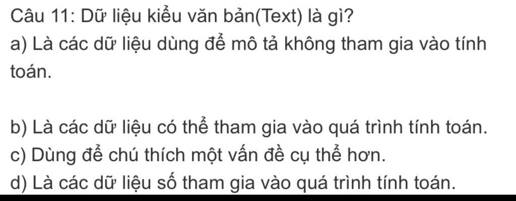 Câu 11: Dữ liệu kiểu văn bản(Text) là gì?