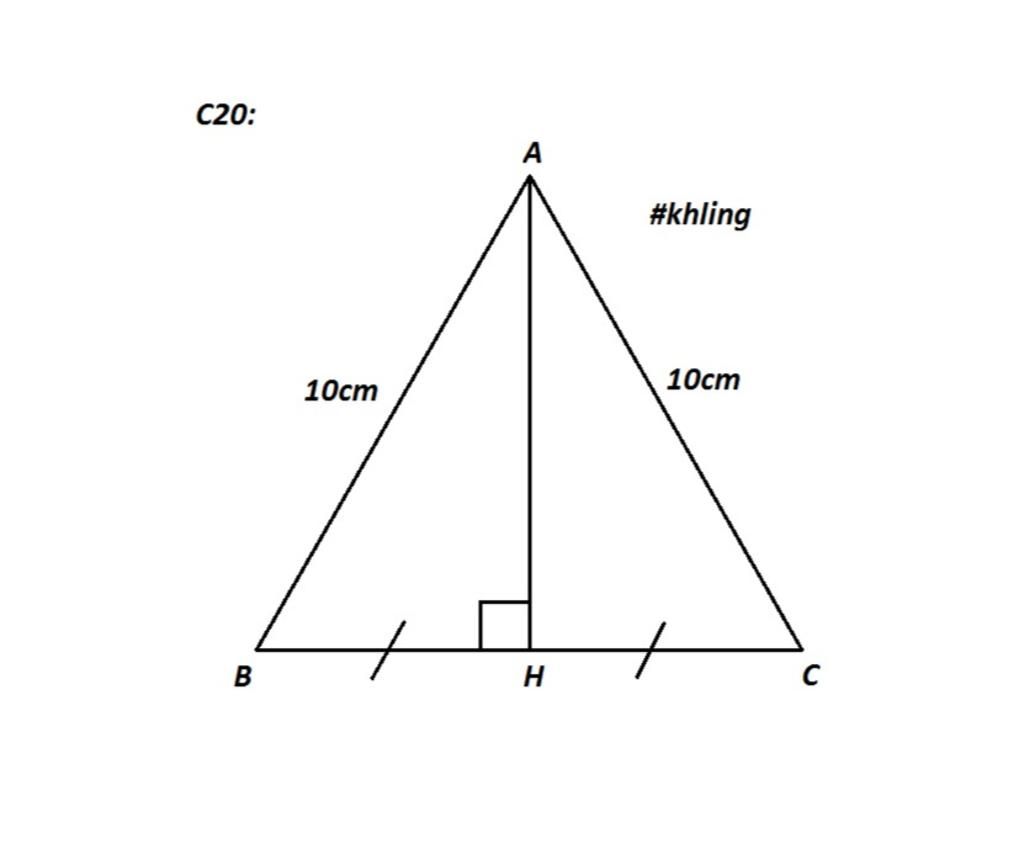 Câu 20. Cho tam giác ABC cân tại A. Đường cao AH. Biết AB = AC = 10cm, BC = 16cm. Độ dài AH là
