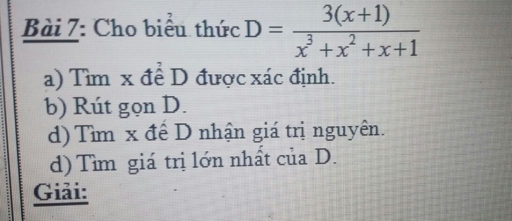Ta có : $D = \dfrac{3(x+1)}{x^3+x^2+x+1}$