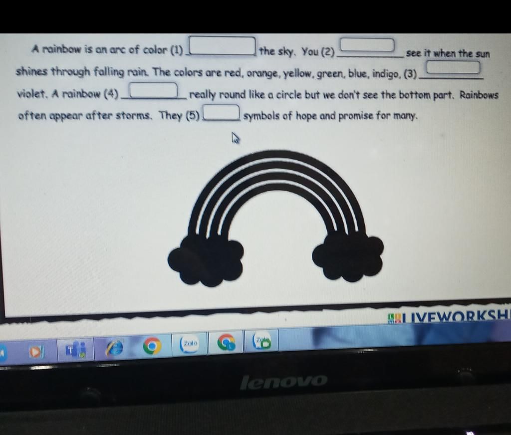 shines through falling rain. The colors are red, orange, yellow, green, blue, indigo, (3).