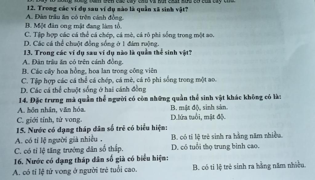 Câu 12: Trong các ví dụ sau ví dụ nào là quần xã sinh vật?
