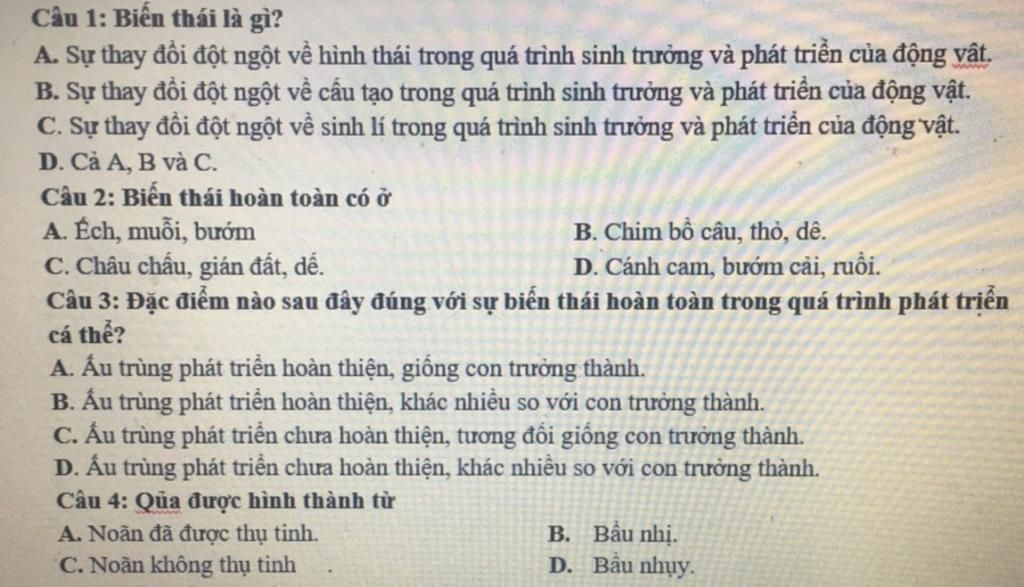 1 A :Biến thái là sự thay đổi đột ngột về hình thái trong qt sinh trưởng và phát triển của động vật