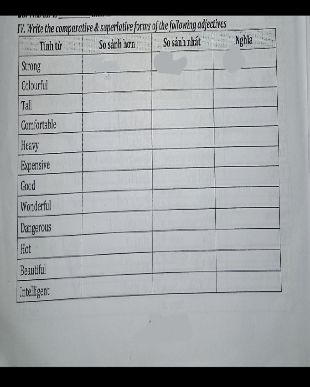 IV. Write the comparative & superlative forms of the following adjectives