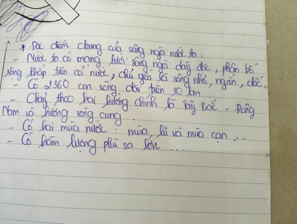 -Sông ngòi Việt Nam cs mạng lưới sông ngòi dày đặc và phân bộ rộng khắp cả nước,trên phạm vi lãnh thổ nước ta cs tới 2360 con sông dài trên 10 km nhưng chủ yếu sông ngòi nước ta ngắn,dốc và nhỏ.