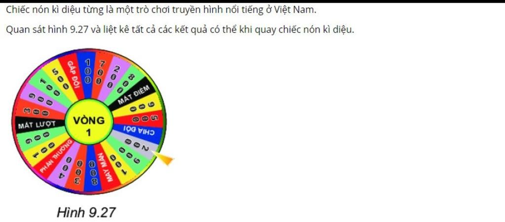 Quan sát hình 9.27 và liệt kê tất cả các kết quả có thể khi quay chiếc nón kì diệu.