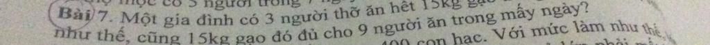 một gia đình cứ 3 người thì ăn hết 15 kg gạo trong12 ngày .hỏi với mức ăn như thế ,cũng 15 kg gạo đó đủ cho 9 người ăn trong mấy ngày ?