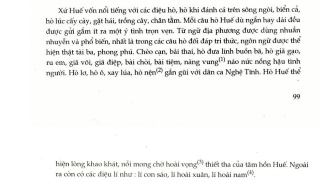 Câu 5: Ca Huế là một hình thức sinh hoạt văn hoá- âm nhạc thanh lịch tao nhã, một tác phẩm tinh thần trân trọng, cần được bảo tồn và phát triển