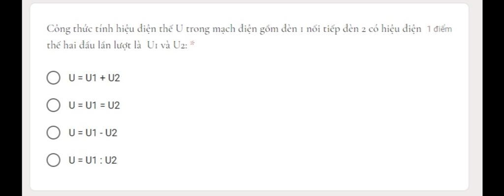 =>công thức tính hiệu điện thế U trong mạch điện gồm đèn 1 nối tiếp đèn 2 có hiệu điện thế 2 đầu đoạn mạch lần lượt là