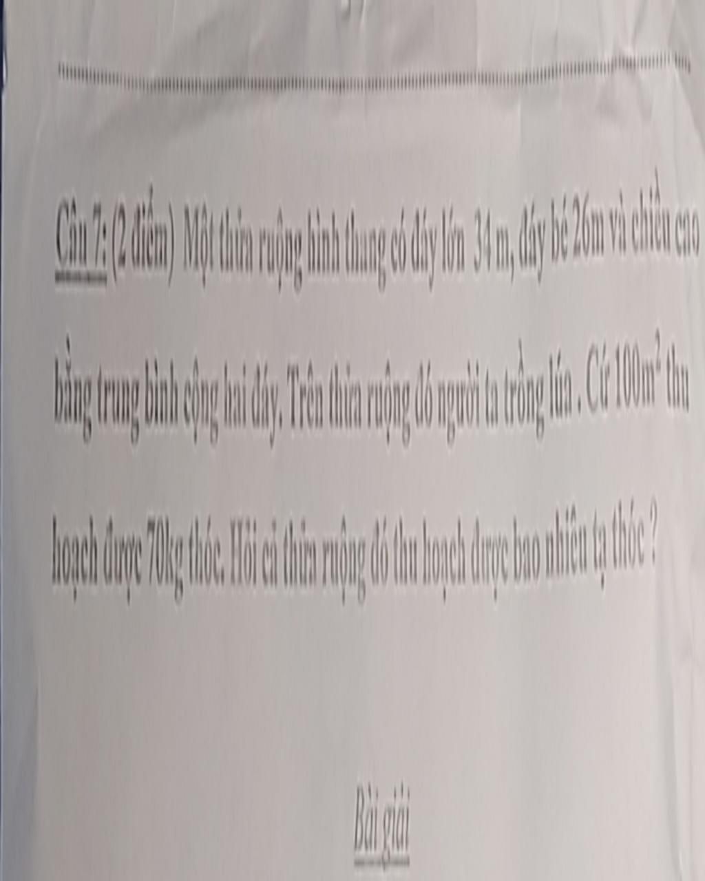 Một thửa ruộng hình thang có đáy lớn 34 m đáy bé 26 m và chiều cao bằng trung bình cộng hai đáy trên thửa ruộng đó người ta trồng lúa cứ 100 mét vuông thu hoạch được 70 kg thóc hỏi cả thửa ruộng đó thu hoạch được bao nhiêu tạ thóc