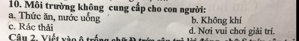 `-` Thức ăn , nước uống , không khí và nơi vui chơi giải trí , .... là được môi trường cung cấp cho con người