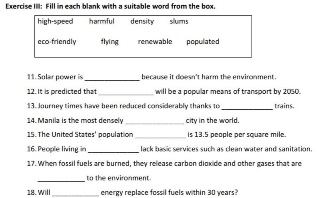 18. Will renewable energy replace fossil fuels within 30 years? (nói về năng lượng thì chỉ có renewable và eco-friendly là thích hợp nhất mà eco-friendly đã dùng rồi)