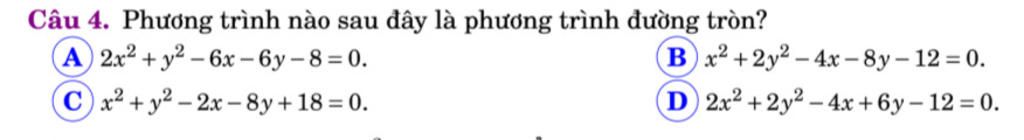 $C. x^2+y^2-2x-8y+18=0\\ a=1, b=4, c=18\\ a^2+b^2-c=1^2+4^2-18=-1<0 \Rightarrow L\\ D. 2x^2+2y^2-4x+6y-12=0\\ \Leftrightarrow x^2+y^2-2x+3y-6=0\\ a=1; b=-\dfrac{3}{2}, c=-6\\ a^2+b^2-c=\dfrac{37}{4}>0 \Rightarrow TM.$