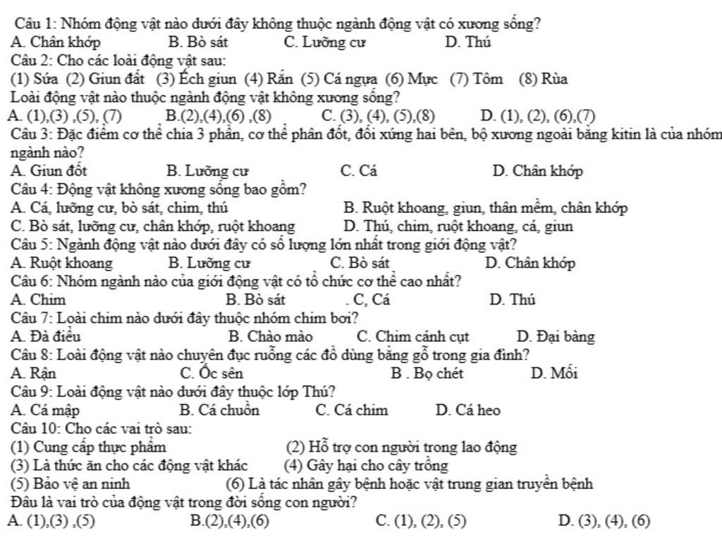Câu 1: Nhóm động vật nào dưới đây không thuộc ngành động vật có xương sống?