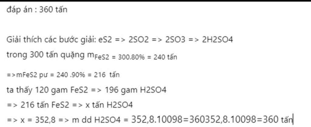 $\rm m_{FeS_2}=300.(100\%-20\%)=240(tấn)$