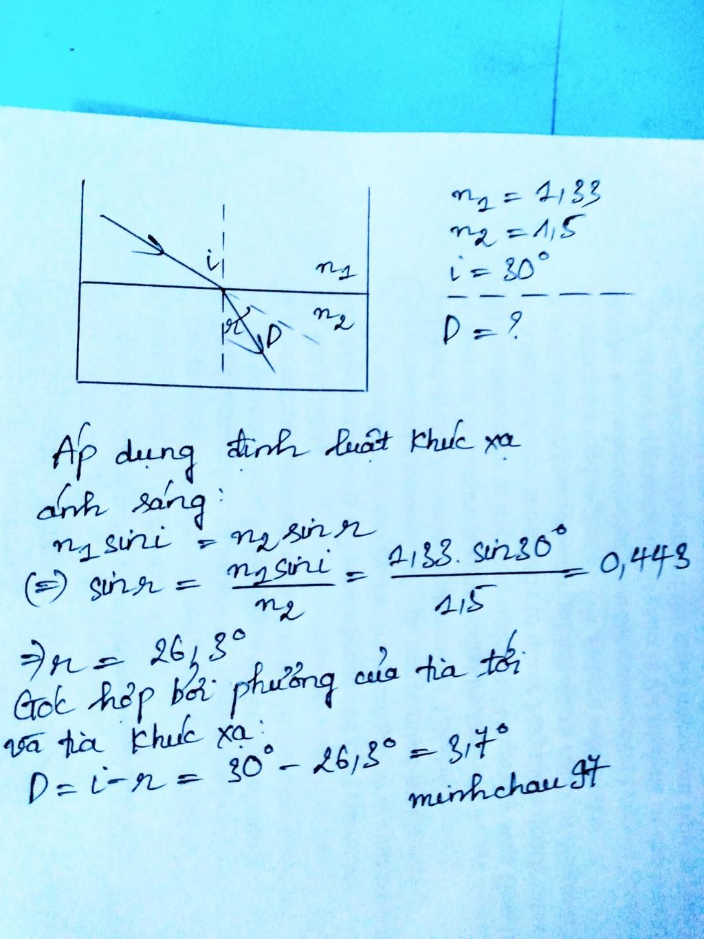 ⇒ $sinr=\dfrac{n_1.sini}{n_2}=\dfrac{1,33.sin30^0}{1,5}$