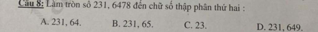 `231,6478` làm tròn đến số thập phân thứ hai thành: