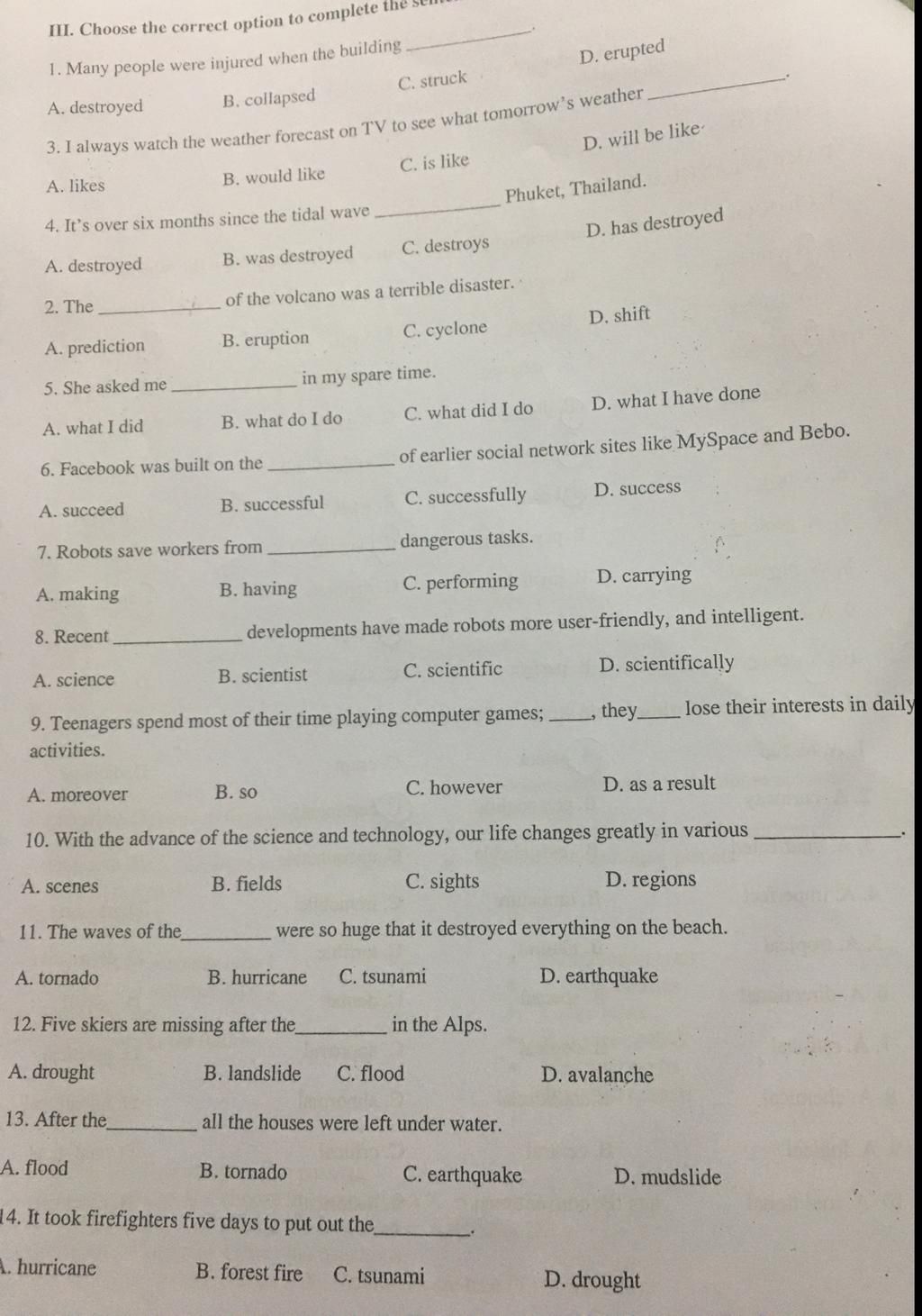 III. Choose the correct option to complete the