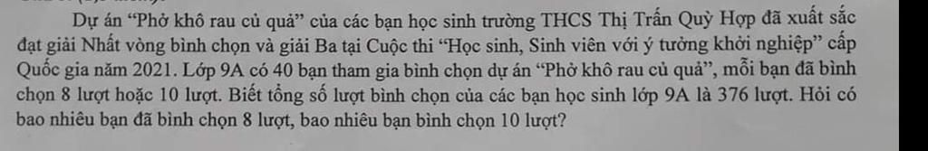 Quốc gia năm 2021. Lớp 9A có 40 bạn tham gia bình chọn dự án “Phở khô rau củ quả”, mỗi bạn đã ...