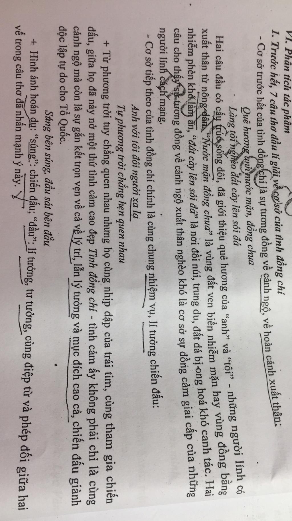 Những người lính cách mạng trong bài thơ tham gia cuộc kháng chiến đều xuất thân từ nông thôn, chưa từng quen biết nhau từ trước. Đúng như Nguyên Hồng đã viết: “Lũ chúng tôi bọn người tứ xứ”, họ có người đến từ miền biển, có người đến từ đồi núi. Nhưng tất cả họ đều lớn lên từ những vùng cơ cực, lớn lên trong cảnh nghèo khó, lam lũ, vất vả. Sự tương đồng trong xuất thân ấy đã giúp họ gần nhau, quen nhau và gắn bó với nhau. Và hơn hết, chất keo kết dính tạo nên tình cảm keo sơn ấy chính là họ có cùng lý tưởng chiến đấu, cùng ý chí tình cảm “Súng bên súng, đầu sát bên đầu”, cùng san sẻ khổ cực, khó khăn “Đêm rét chung chăn thành đôi tri kỷ”. Để rồi khép lại đoạn thơ đầu là dòng thơ chỉ với một từ “Đồng chí”. Dòng thơ đặc biệt này làm thêm ý tình sâu sắc của đoạn thơ, giải thích được vì sao những người lính cách mạng đã gắn bó thân thiết máu thịt với nhau. Câu thơ như một nút nhấn nổi bật trong bản nhạc, là sự thăng hoa và kết tinh của mọi cảm xúc, mọi tình cảm.