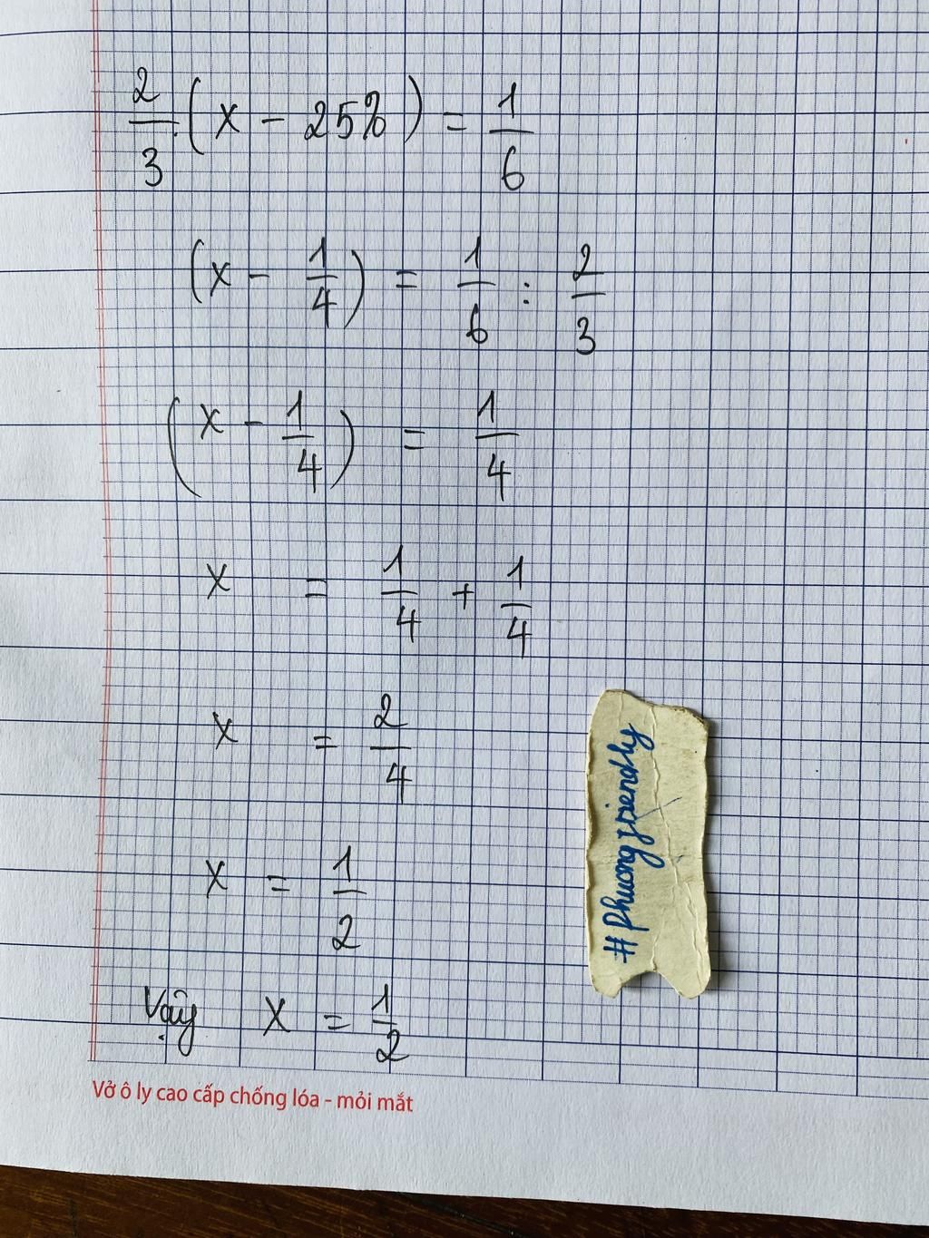 $\dfrac{2}{3}.(x-$ $\text{25%}$ $)= \dfrac{1}{6}$