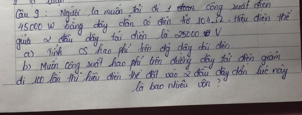 b) Muốn công suất hao phí giảm 100 lần thì hiệu điện thế đặt vào 2 đầu dây dẫn là 10 lần.