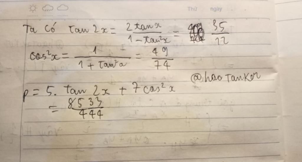 $\begin{array}{l} P = 5\tan 2x + 7{\cos ^2}x\\ = 5.\dfrac{{2\tan x}}{{1 - {{\tan }^2}x}} + 7.\dfrac{1}{{1 + {{\tan }^2}x}}\\ = 5.\dfrac{{2.\dfrac{5}{7}}}{{1 - {{\left( {\dfrac{5}{7}} \right)}^2}}} + 7.\dfrac{1}{{1 + {{\left( {\dfrac{5}{7}} \right)}^2}}}\\ = \dfrac{{8533}}{{444}} \end{array}$