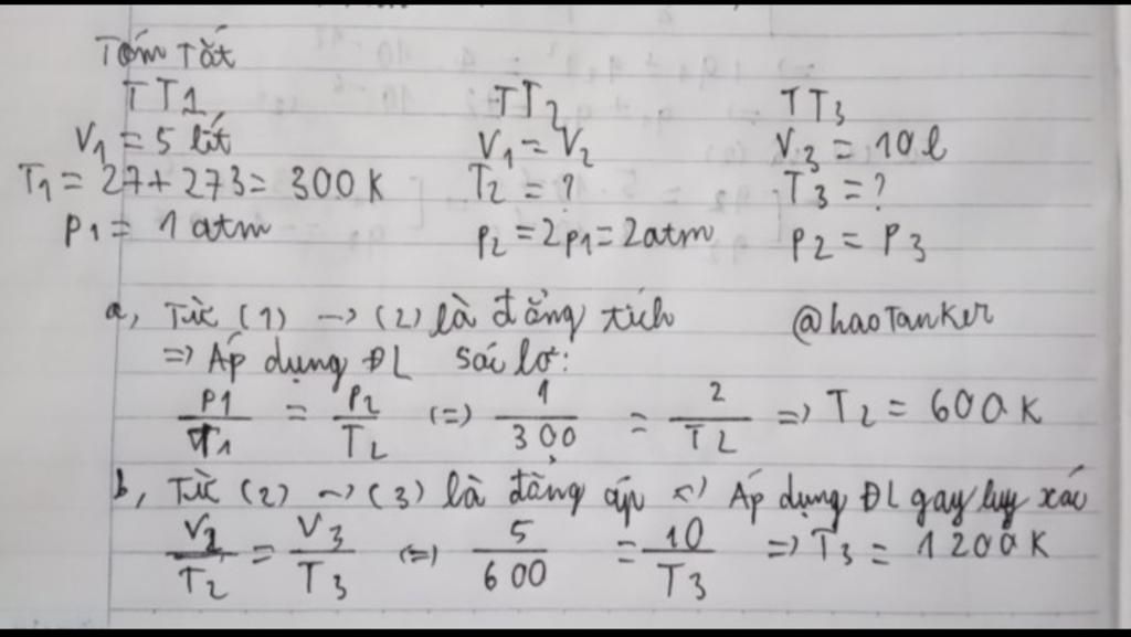 Một khối khí lí tưởng có thể tích 5 lít, nhiệt độ 27°C, áp suất 1 atm, biến đổi qua hai quá trình: