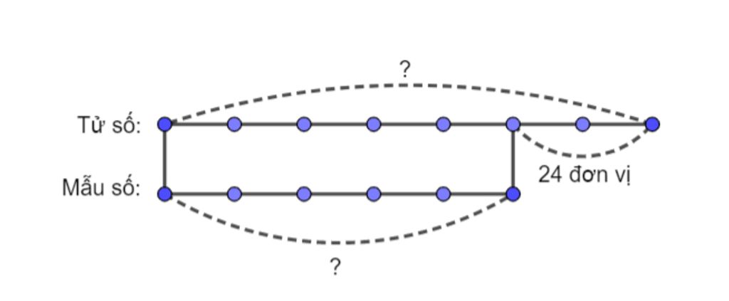 Nếu bớt ở tử số đi 24 đơn vị, ta được phân số mới có giá trị bằng 1. Vậy tử số hơn mẫu số là 24 đơn vị. Ta có sơ đồ như hình vẽ