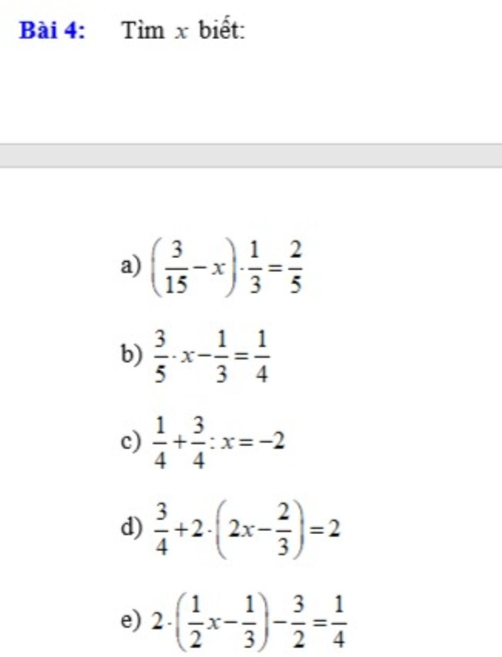 `a) ( 3/15 - x ) . 1/3 = 2/5`