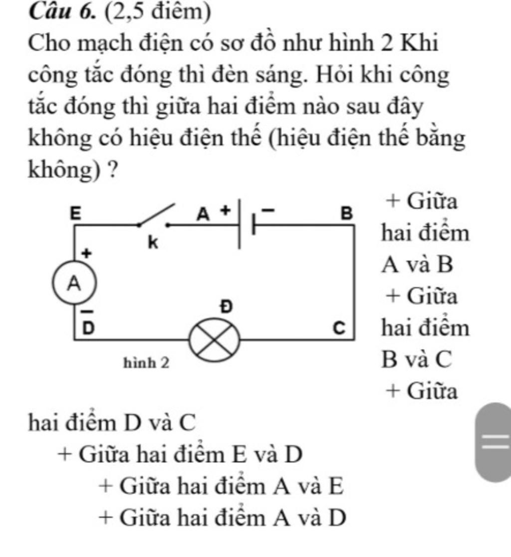 vì điểm A nối cực (+) và điểm E nối với cực (-) của nguồn điện nên khi ngắt công tắc và đặt vôn kế vào hai đầu A, E sẽ tạo ra sự chênh lệch về điện thế giữa hai điểm A, E.