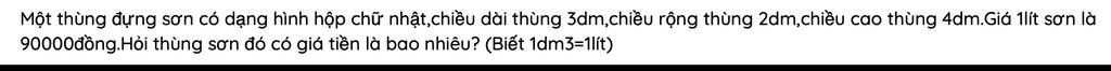 `->` Áp dụng : `V = a xx b xx h = 3 xx 2 xx 4 = 24 (dm^3) = 24 l`