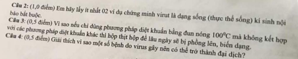 Câu 2: (1,0 điểm) Em hãy lấy ít nhất 02 ví du chứng minh virut là dang sống (thực thể sống) kí sinh noi