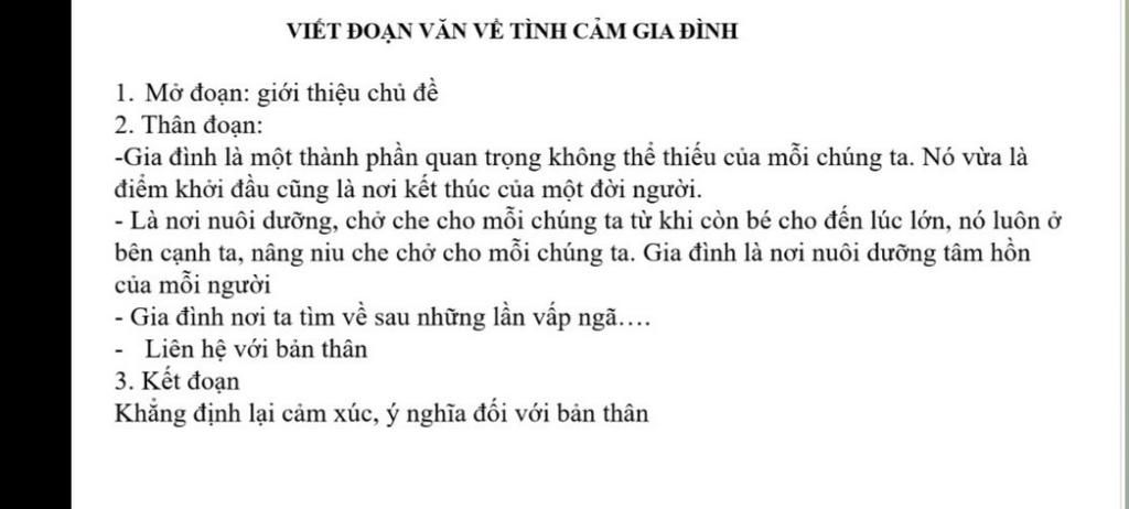 Trong cuộc sống, ai có thể sống không tình thương gia đình ? Chắc chắn là không rồi ! Vậy bạn có biết gia đình là gì mà quan trọng như thế không ? Gia đình chính là nới chứa người thân, người anh, chị, hay tấm lòng dạt dào của cha, mẹ. Bạn bè có thể đâm sau lưng bất kì lúc nào, nhưng tình cảm gia đình không bao giờ thay đổi. Sinh con ra mất `9` tháng `10` ngày là mẹ, nuôi con hết cả thanh xuân đó là cha, dạy học, chỉ bảo không ai khác ngoài anh ( chị ). Cực khổ thế ai lỡ bỏ đi ? Có gia đình là có tất cả, không có họ, tất cả quy về `0`. Bởi gia đình chăm sóc ta để ta xuất phát đến vạch đích của mục tiêu ! Gia đình quan trọng thế, nhưng lại vẫn còn những cặn bã của xã hội bất hiếu với cha mẹ, bất nghĩa với anh chị em, thật đáng phê phán ! Nhìn lại bản thân, tôi cũng chẳng giúp được cha mẹ nhiều, tôi chỉ làm được những công việc nhỏ nhẹ mà thôi ! Ai ơi còn cha mẹ, xin đừng làm họ khóc !