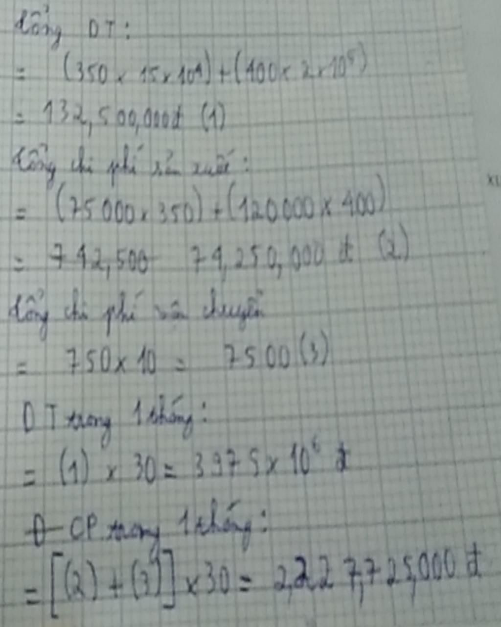 Doanh nghiệp X bán hàng, gồm mặt hàng A và B, 1 tháng trung bình bán 350 cái loại A giá 150.000đ/cái, 400 cái loại B giá 200.000đ/cái. Chi phí nguyên vật liệu làm ra 1 sphẩm loại A là 75000đ, loại B là 120000. Chi phí vận chuyện và trả công lao động để làm ra 1 sphẩm bình quân 10.000đ/cái. Tính doanh thu và chi phí trong một tháng của doanh nghiệp X