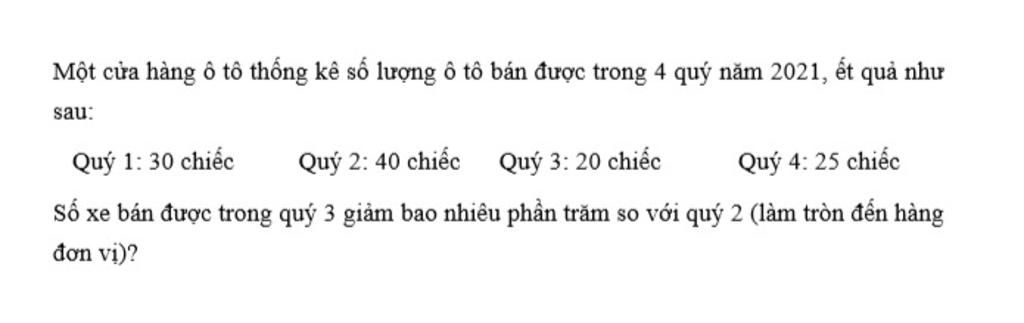 Số xe bán được trong quý 3 giảm bao nhiêu phần trăm so với quý 2 (làm tròn đến hàng