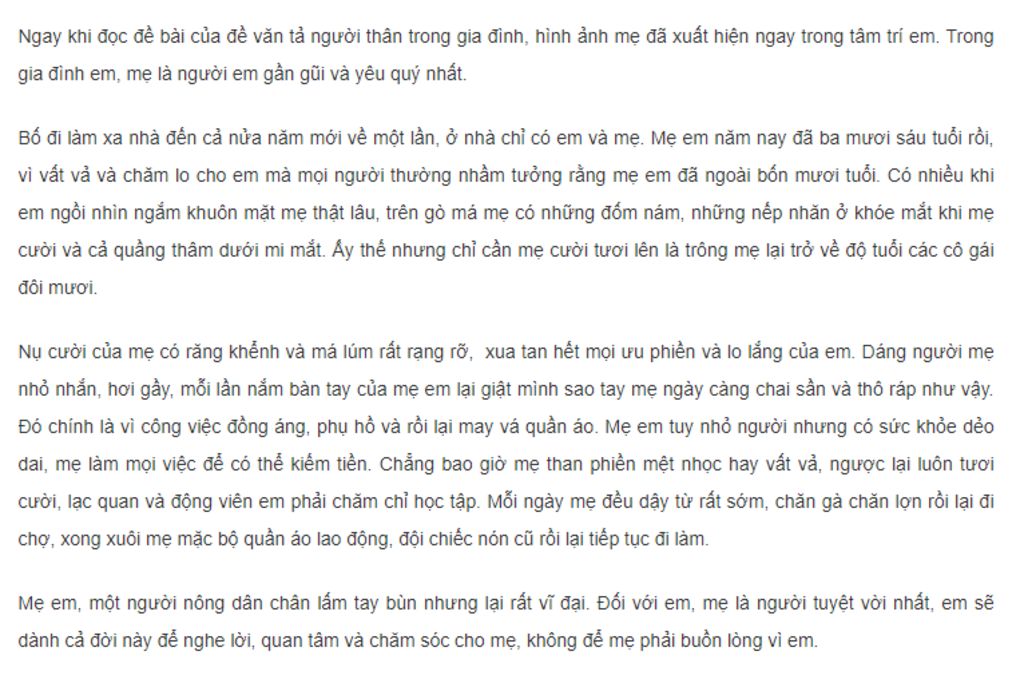 Mẹ không chỉ sinh ra và nuôi tôi khôn lớn nên người mà mẹ còn là người thầy đầu tiên của tôi. Một người thầy vừa nghiêm khắc, tận tụy, vừa độ lượng, yêu thương mà suốt đời, tôi không thể nào quên!