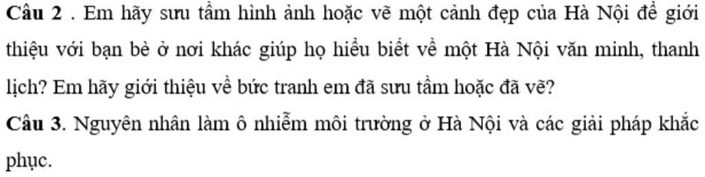 Câu 2: Bạn tự làm nha. Phần này vẽ bạn chỉ cần vẽ một phong cảnh của Hà Nội và giới thiệu cho bạn bè của bạn.