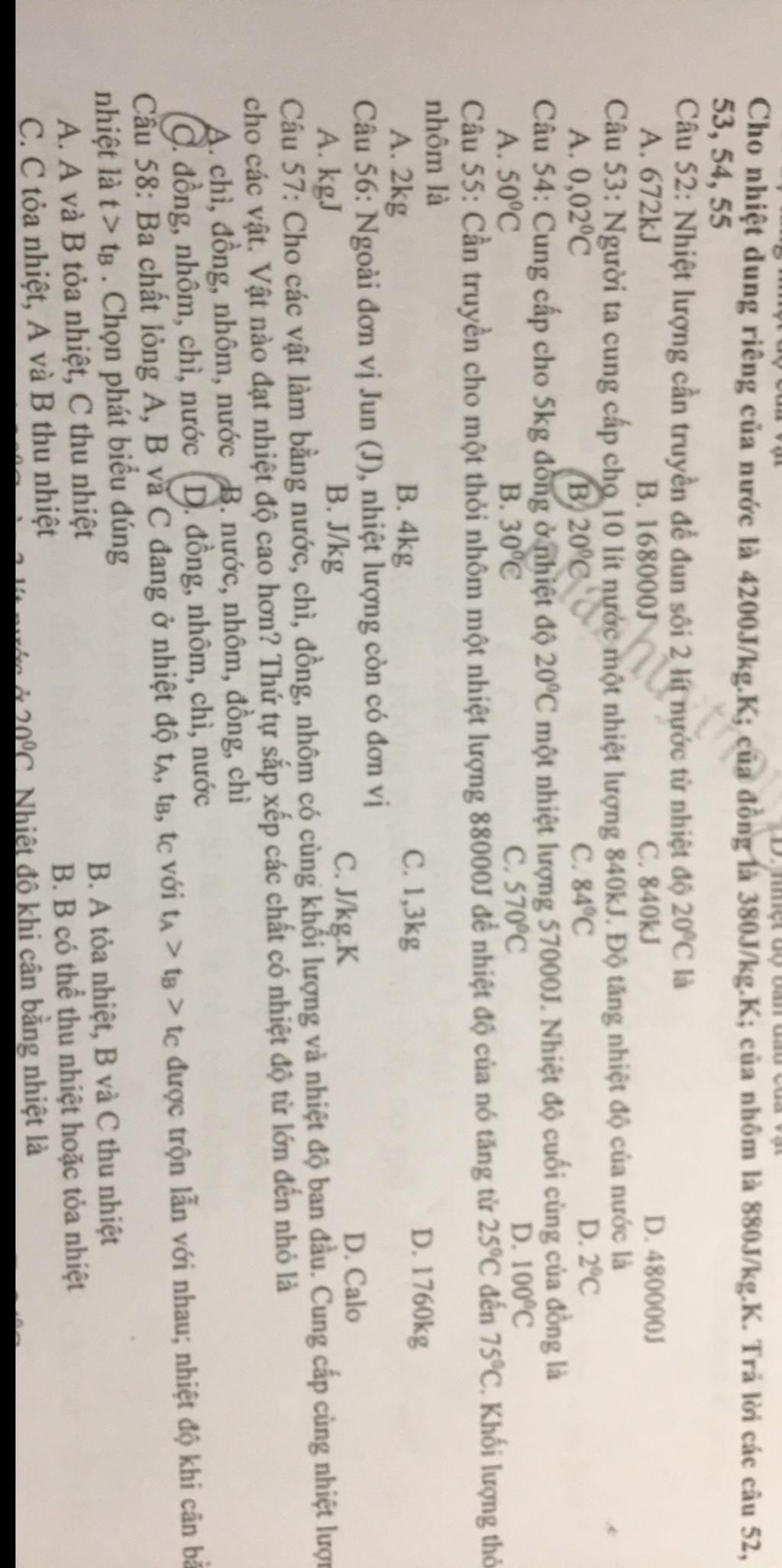 Cho nhiệt dung riêng của nước là 4200J/kg.K; của đồng là 380J/kg.K; của nhôm là 880J/kg.K. Trả lời các câu 52,