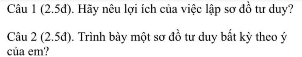 câu 1: -Sơ đồ tư duy giúp cho chúng ta dễ dàng cấu trúc, sắp xếp lại các ý tưởng, thông tin một cách trực quan, dễ nhớ, hiểu, phục vụ cho học tập, nghiên cứu và ý tưởng nhiều.