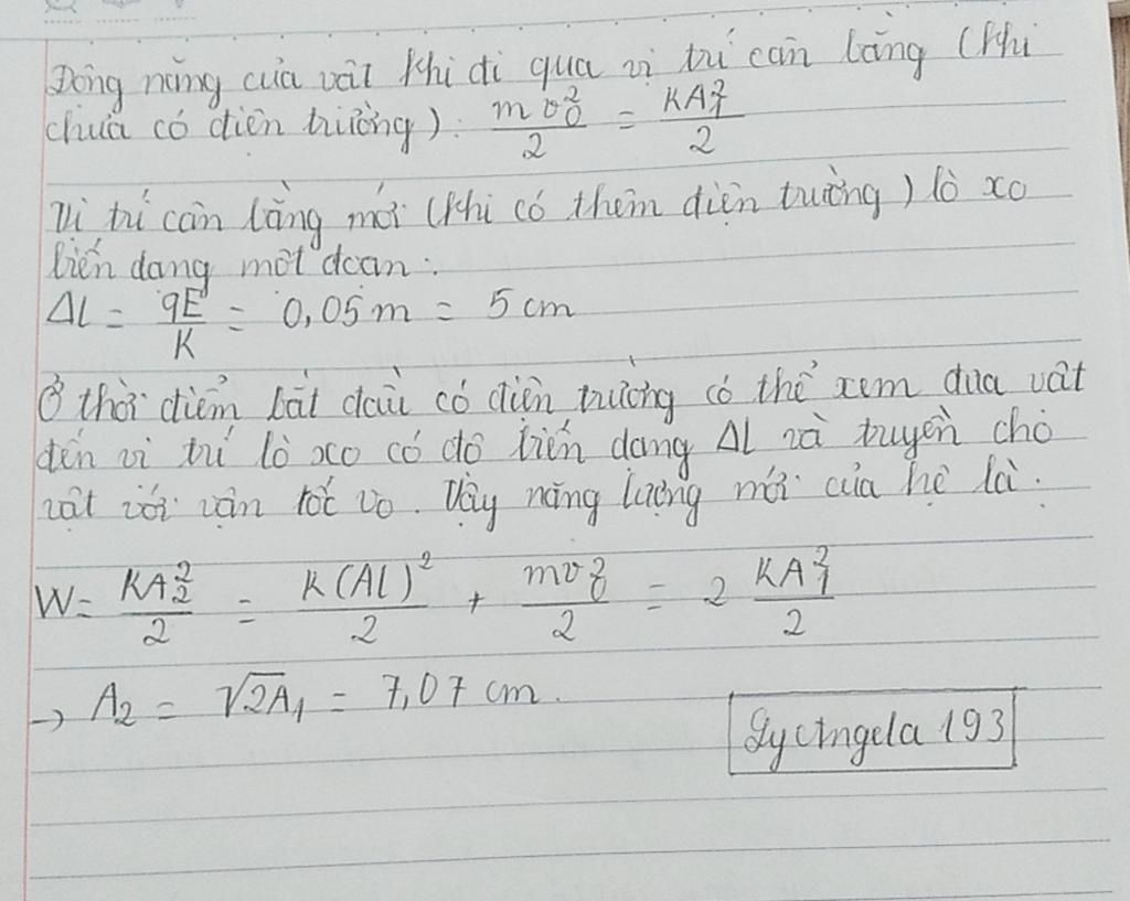 Một vật nặng có khối lượng m, điện tích q=+5.105(C)q=+5.105(C) được gắn vào lò xo có độ cứng k=10N/mk=10N/m tạo thành con lắc lò xo nằm ngang . Điện tích trên vật nặng không thay đổi khi con lắc dao động và bỏ qua mọi ma sát. Kích thích cho con lắc dao động điều hòa với biên độ 5cm5cm. Tại thời điểm vật nặng đi qua vị trí cân bằng và có vận tốc hướng ra xa điểm treo lò xo, người ta bật một điện trường đều có cường độ E=104V/mE=104V/m, cùng hướng với vận tốc của vật. Khi đó biên độ dao động mới của con lắc lò xo là: