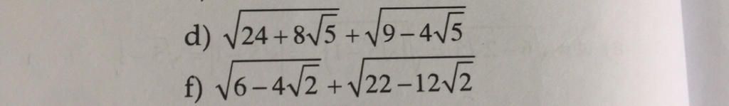 $ d)\sqrt {24 + 8\sqrt 5 } + \sqrt {9 - 4\sqrt 5 } \\ = \sqrt {24 + 2.2.2\sqrt 5 } + \sqrt {9 - 2.2.\sqrt 5 } \\ = \sqrt {{{(2\sqrt 5 )}^2} + 2.2.2\sqrt 5 + {2^2}} + \sqrt {{{(\sqrt 5 )}^2} - 2.2.\sqrt 5 + {2^2}} \\ = \sqrt {{{\left( {2\sqrt 5 + 2} \right)}^2}} + \sqrt {{{\left( {\sqrt 5 - 2} \right)}^2}} \\ = \left| {2\sqrt 5 + 2} \right| + \left| {\sqrt 5 - 2} \right| \\ = 2\sqrt 5 + 2 + \sqrt 5 - 2 \\ = 3\sqrt 5 \\ f)\sqrt {6 - 4\sqrt 2 } + \sqrt {22 - 12\sqrt 2 } \\ = \sqrt {6 - 2.2.\sqrt 2 } + \sqrt {22 - 2.2.3\sqrt 2 } \\ = \sqrt {{2^2} - 2.2.\sqrt 2 + {{(\sqrt 2 )}^2}} + \sqrt {{{(3\sqrt 2 )}^2} - 2.2.3\sqrt 2 + {2^2}} \\ = \sqrt {{{\left( {2 - \sqrt 2 } \right)}^2}} + \sqrt {{{\left( {3\sqrt 2 - 2} \right)}^2}} \\ = \left| {2 - \sqrt 2 } \right| + \left| {3\sqrt 2 - 2} \right| \\ = 2 - \sqrt 2 + 3\sqrt 2 - 2 \\ = 2\sqrt 2 \\ $