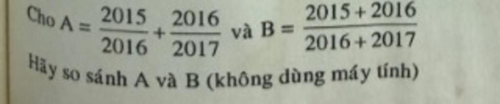 Ta có : `B= {2015+2016}/{2016+2017} = 2015/{2016+2017} + 2016/{2016+2017}`