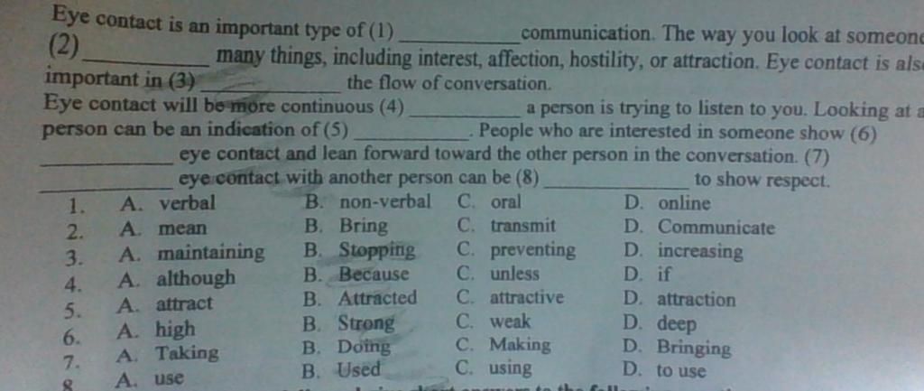 4, D - if (Eye contact will be more continuous if a person is trying to listen to you. - Giao tiếp bằng mắt sẽ liên tục hơn nếu một người đang cố gắng lắng nghe bạn.)