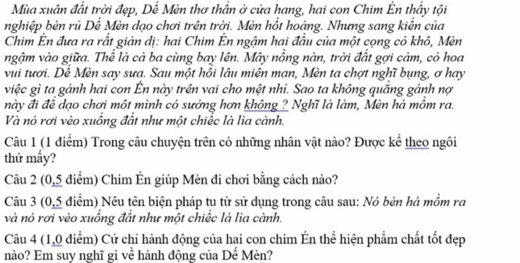 - Trong câu chuyện trên có nhân vật: Dễ Mèn và hai con Chim Én.