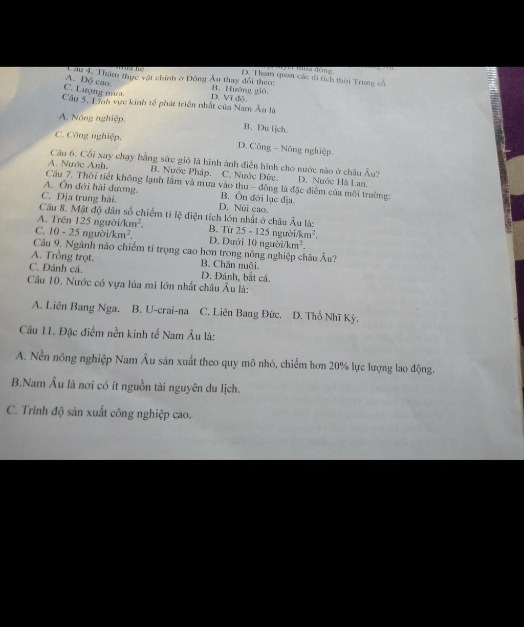 ⇒Ở các nước Nam Âu, ven Địa Trung Hải, vào mùa thu – đông thời tiết không lạnh lắm và có mưa, thường là những trận mưa rào. Mùa hạ nóng, khô.
