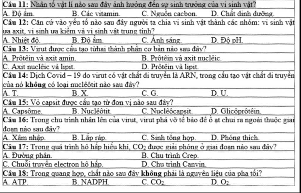 : Nhân tố vật lí nào sau đây ảnh hưởng đến sự sinh trưởng của vi sinh vật? A. Độ ẩm. B. Các vitamin. C. Nguồn cacbon. D. Chất dinh dưỡng.