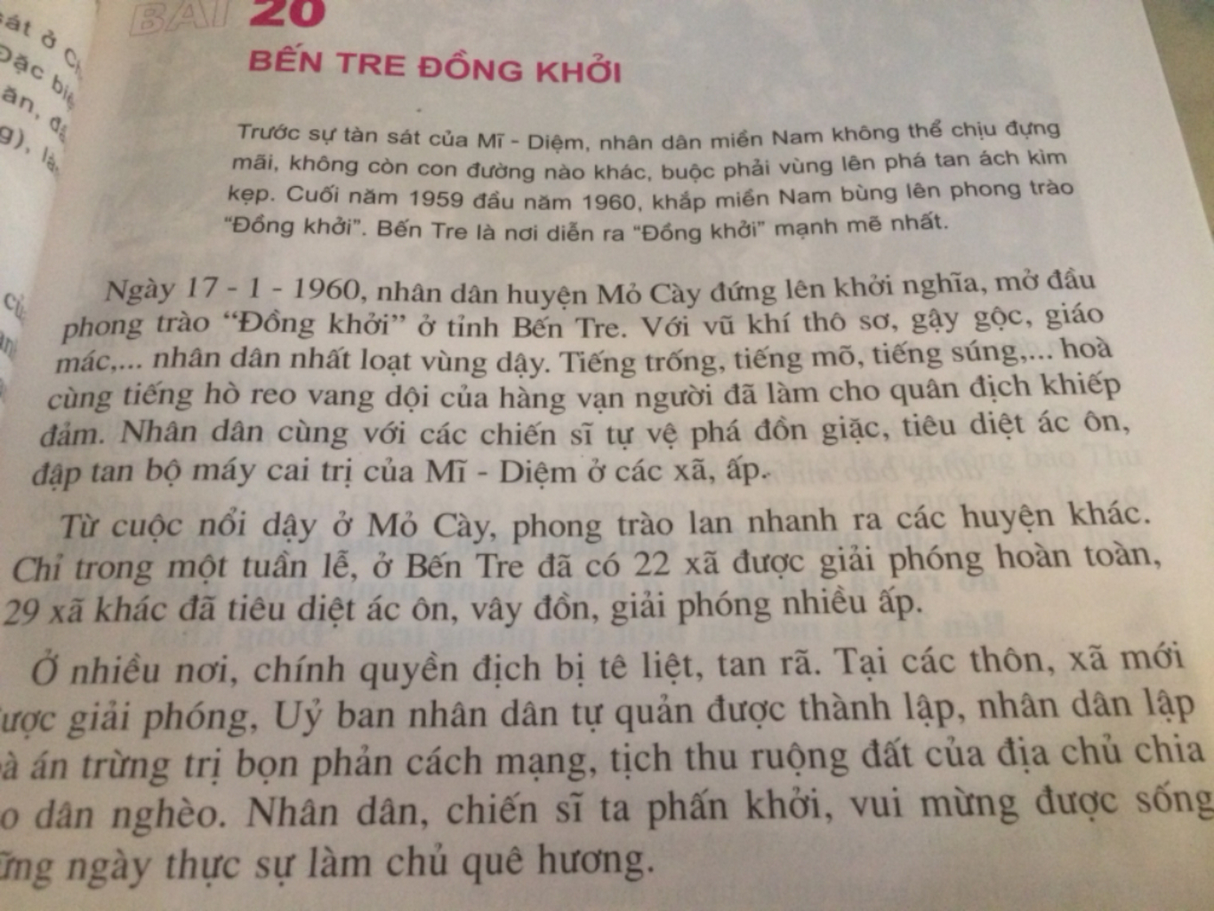 Câu 3: Thời gian bắt đầu phong trào đồng khới ở Bến Tre là 17 - 1 - 1960