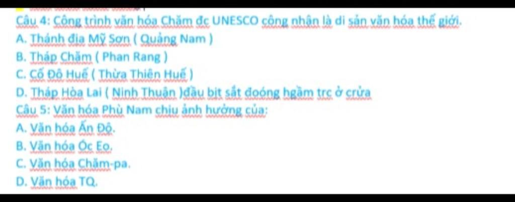 Câu 4 : A.Thánh địa Mỹ Sơn(Quảng Nam)